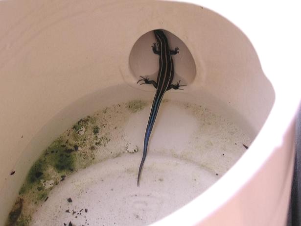 子どもの頃、近所の土手にはカナヘビしかいなかった。 だから山なんかへいって青光りしたトカゲを見ると欲しくてたまらなかった。 今、川崎郊外に住んでいるが、けっこうこの憧れのトカゲがいるから嬉しい。 今日はジョウロの中にいた。水浴びでもしてるのかと思ってしばらく眺めていたが、 どうやら誤って落ちて出られなくなったらしいので出してやった。なかなか触れないトカゲに 幸運にも触る事が出来た。小魚のように手のなかでピチピチしていた。