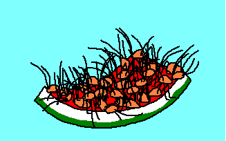 カブトムシをたくさん捕まえて虫かごに入れ 外に置いておいたら、蓋を自分で開けてみんなその日の夜 逃げてしまいました。悔しくて、なんとか1匹でも取り返そうと、 スイカの皮を縁の下に置き、そこにおびき寄せる作戦を試みました。 夜遅く、様子を見に行き懐中電灯で縁の下を照らしてみると、 スイカにはビッシリとカマドウマがたかってました。 作戦大失敗。 ボタンを押すと駆除できます。気持ち悪くてすいません。 |