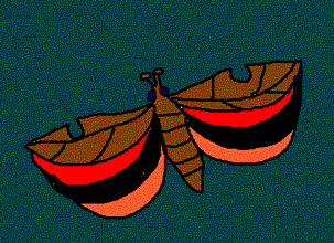 | しばらくじっとしていましたが、 こらえきれずに飛びだすと、その地味な枯葉色の羽の下からビックリするほどどぎついオレンジ色と黒の 羽があらわれました。すごかった。 |